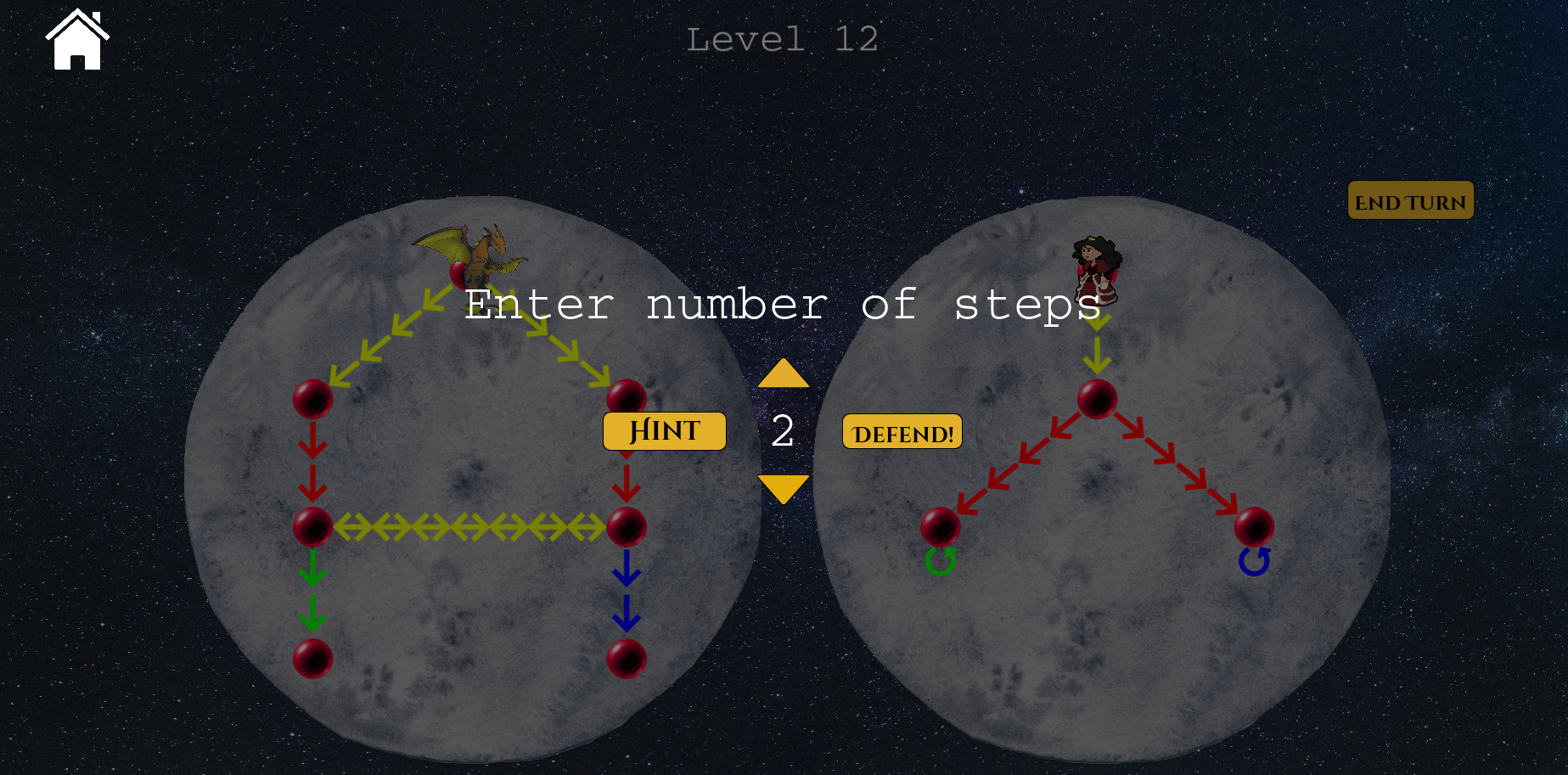 You are a princess and, instead of waiting for a white knight, you’re taking fate into your own hands by fighting against the dragon. You’re smart, so before you fight you take a look at the playing field and negotiate how many steps he is allowed to take. For every step the dragon takes you have to defend yourself with the same action. If you manage to do the negotiated number of steps, you win and will even get a part of his treasure.