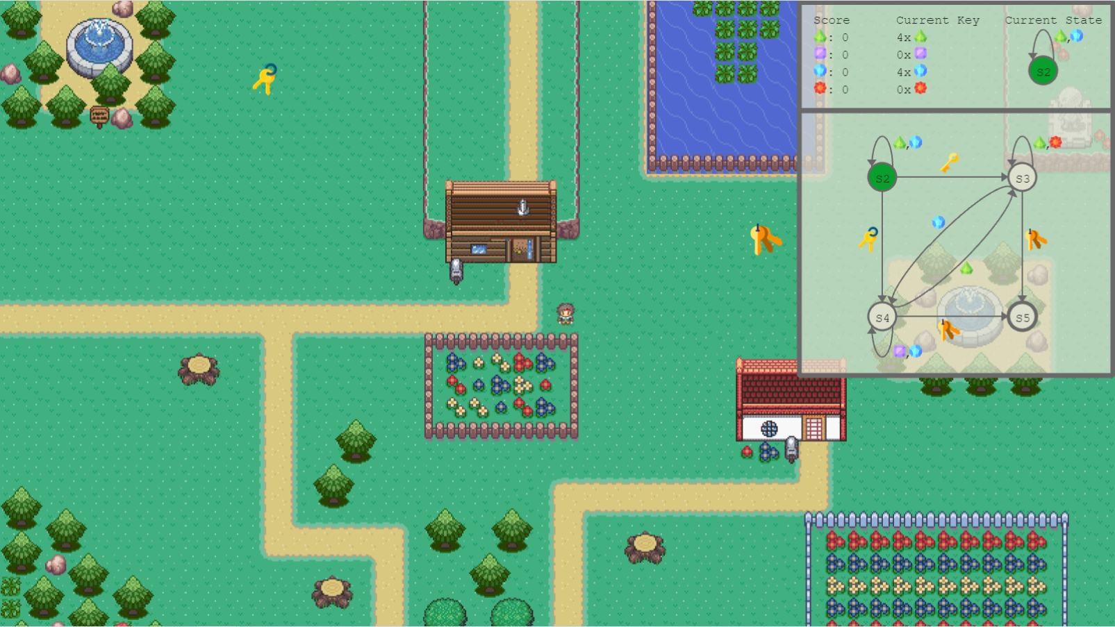 A state space is the set of all possible configurations of a system. The goal of the game is to reach the given end-state by realizing a possible configuration by collecting the bubbles and keys (input alphabet). The player can only collect the elements which are allowed in their current state.